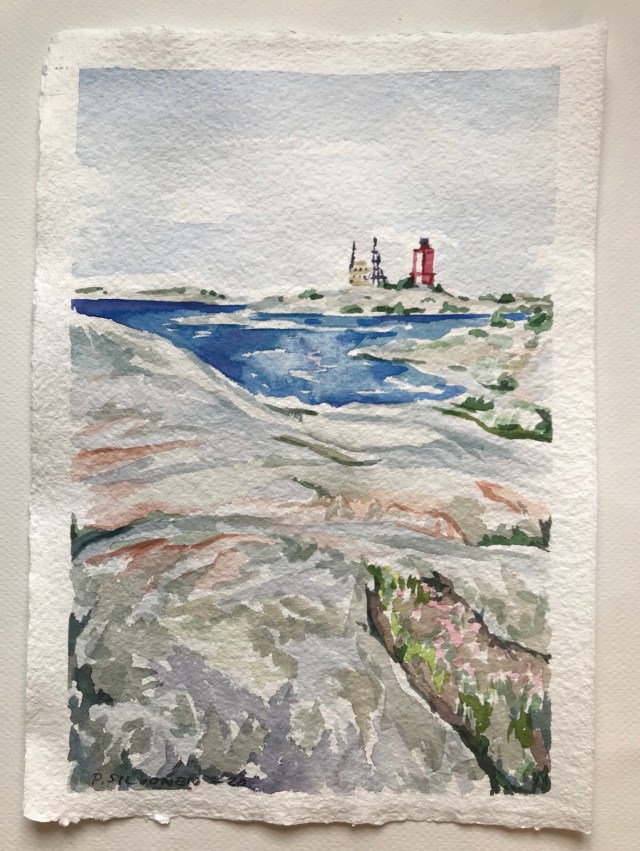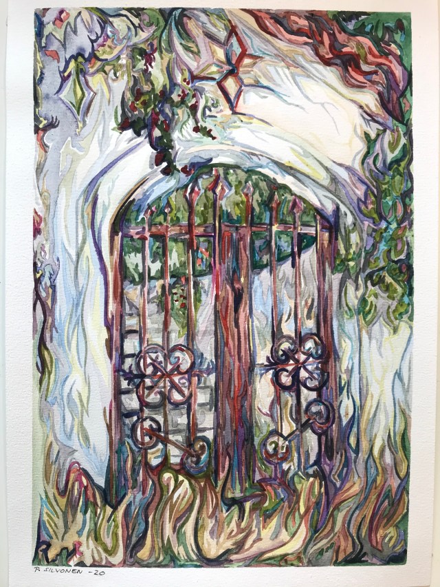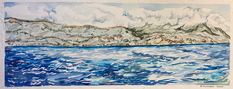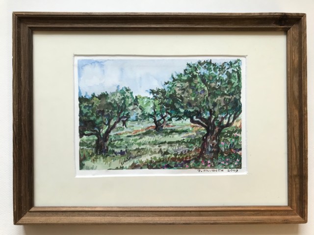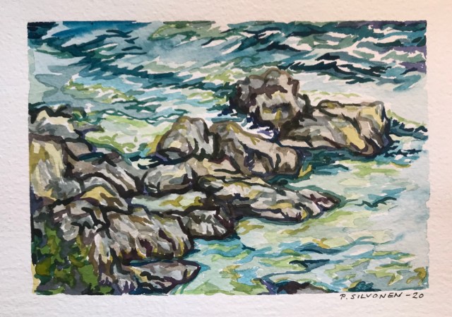 ”Utö”,sarjasta ”Minä hämmästyin meren kauneudesta uudelleen” v. 2021 akvarelli paperille, koko 18 * 48 cm”Loppukesäinen päivä metsäjärvellä” v.2021 akvarelli paperille, koko 18*48 cm”Pilvet nuolee vuoria;Meriretki Karpathoksella” v. 2020 akvarelli paperille, koko 18* 48 cm”Rautaportin tarinoita” v. 2020, akvarelli, koko 40*28 cmSarjasta matkakuvia; ”Minä hämmästyin meren kauneudesta uudelleen” v.2020, akvarelli, koko 16 *21 cmSarjasta matkakuvia ”Eräs kesäpäivä Utön kallioilla” v. 2020 akvarelli, koko 26 * 13 cm”Oliivipuita Pigadian liepeillä” v. 2019, akvarelli.”Työhuoneella II” v. 2015 , akvarelli, koko 32* 25 cm